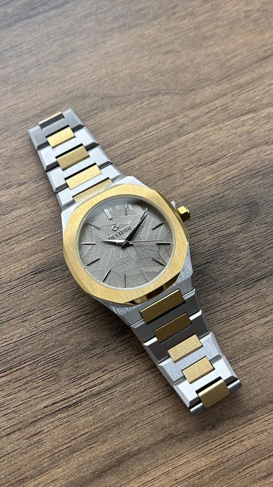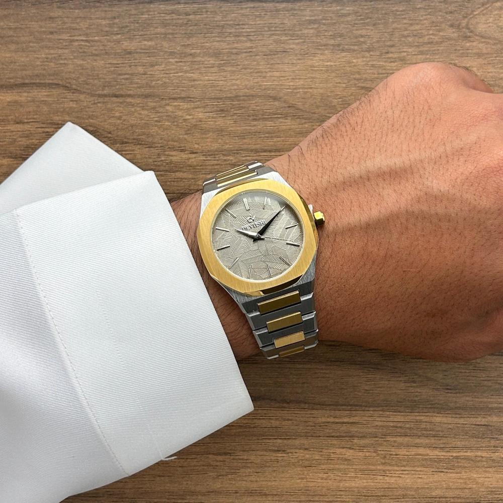 ساعة يد أنيقة بميناء رمادي بتفاصيل انيقة وحزام استيل مطفي بلون فضي و ذهبي، بتصميم عصري مقاوم للماء مع ضمان لمدة سنتين يشمل اللون والعيوب الفنية.