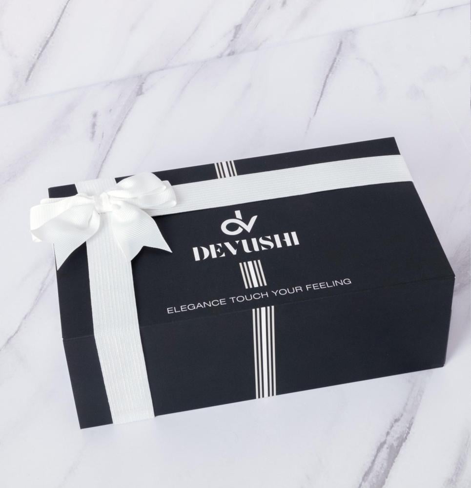 يأتي الطقم في علبة رمادية فاخرة مع شريطة بيضاء أنيقة، داخلها كيس الماركة الرسمي، مما يجعله هدية مثالية للرجل العصري.