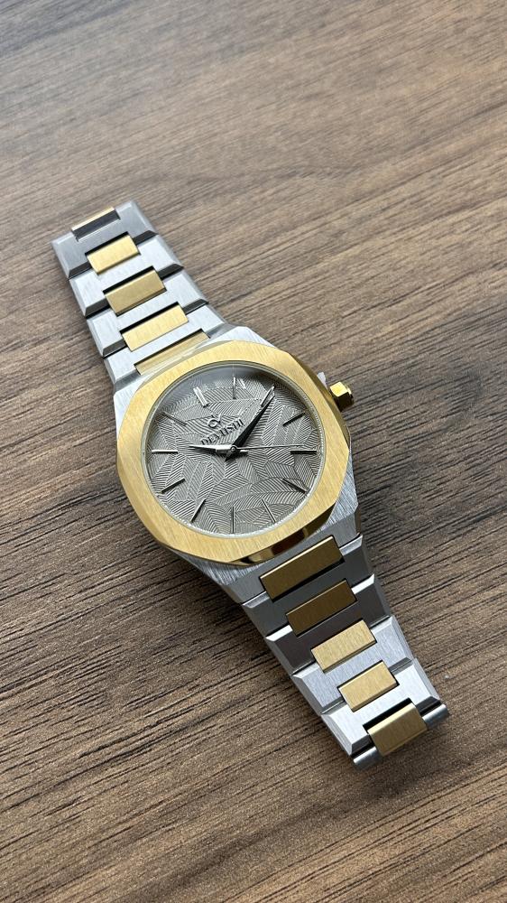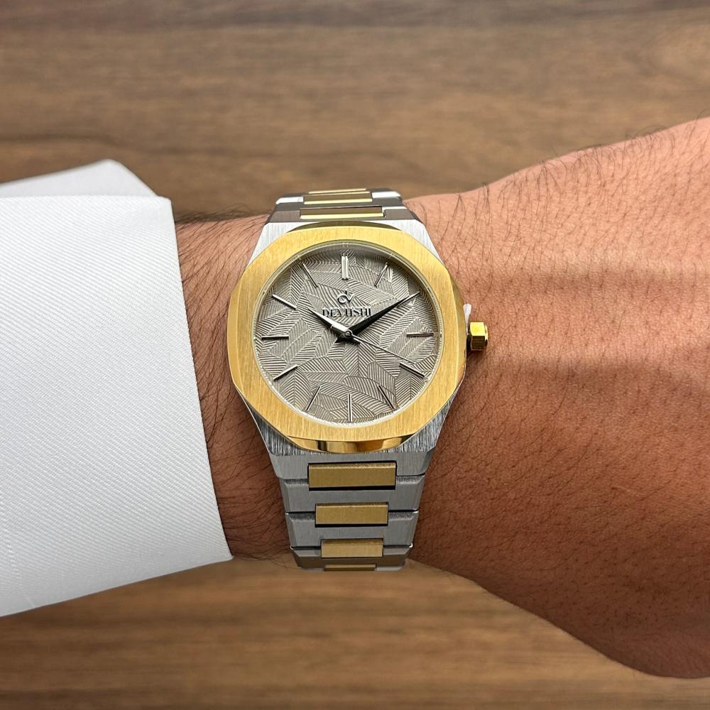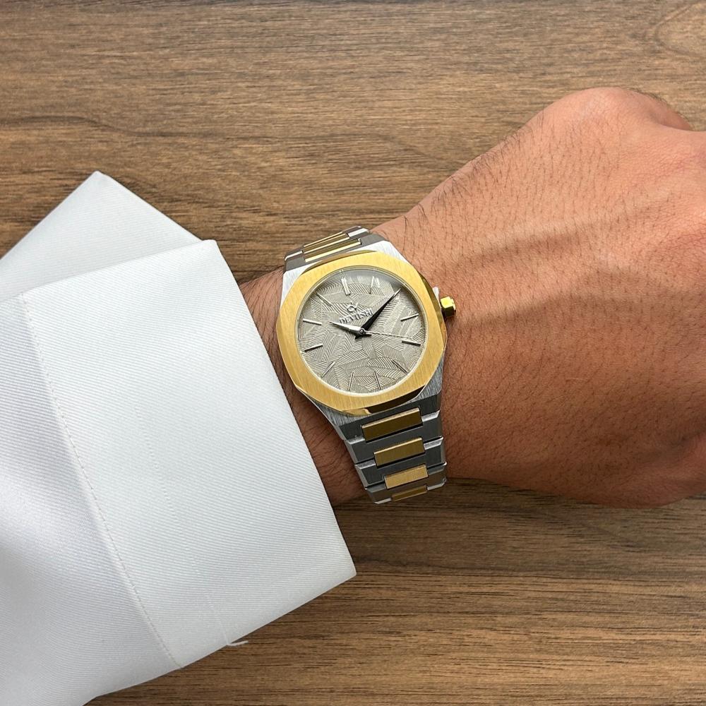 يضم الطقم ساعة يد أنيقة بميناء رمادي بتفاصيل انيقة وحزام استيل مطفي بلون فضي و ذهبي، بتصميم عصري مقاوم للماء مع ضمان لمدة سنتين يشمل اللون والعيوب الفنية.