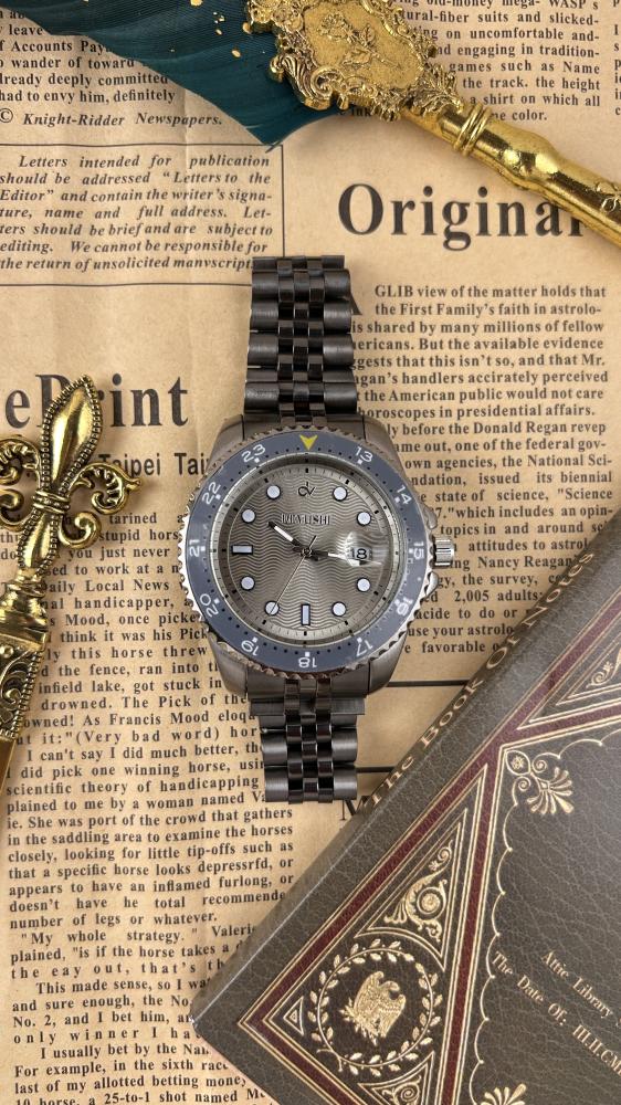تأتي الساعة بلون رمادي معدني أنيق، وسوار استيل مصقول بلمعان جذاب، مع ميناء بتفاصيل مموجة تمنحها حضوراً مميزًا.