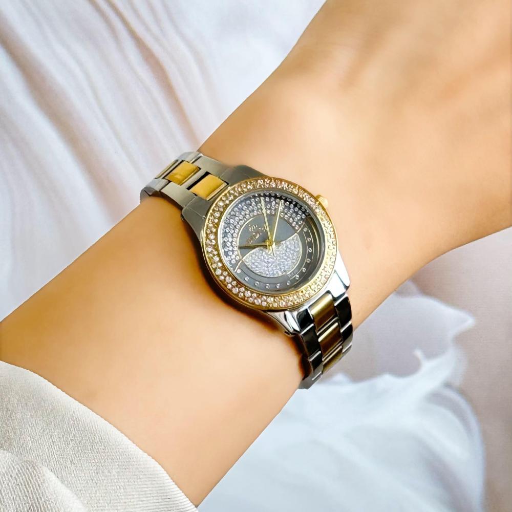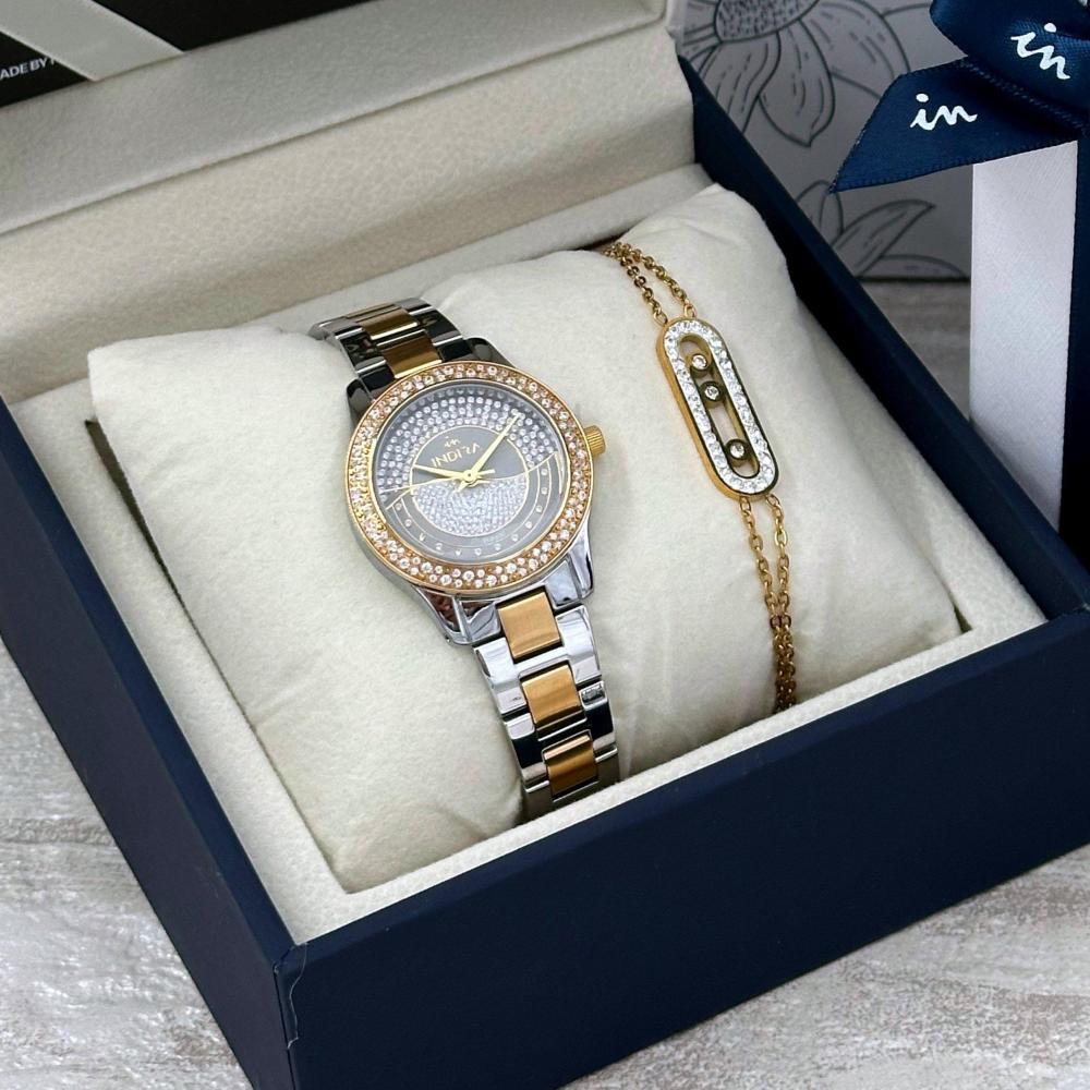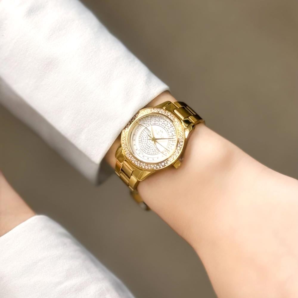 الساعة النسائية من انديرا مصنوعة من استيل مقاوم للصدأ بجودة عالية، بإطار ذهبي مرصّع بفصوص زركون لامعة تمنحك حضورًا متوهجًا، وميناء فضي أنيق. مقاومة للماء، وخفيفة على المعصم – مثالية للاستخدام اليومي والمناسبات.