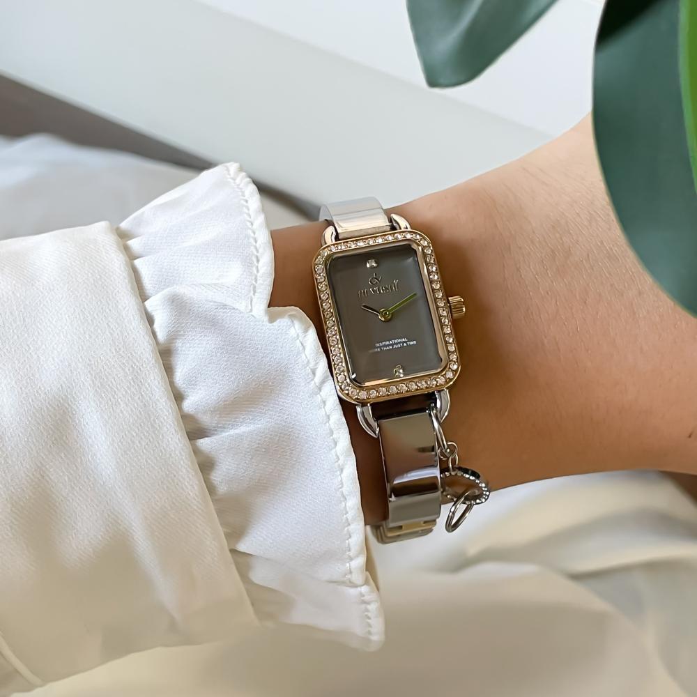 الساعة تأتي بهيكل من الستانلس ستيل المقاوم للصدأ بلون ذهبي وفضي جذاب، مع إطار مرصّع بفصوص الزركون البراقة التي تمنح لمعانًا ساحرًا يلفت الأنظار. ميناء الساعة الرمادي مصمم بعناية ليوفر قراءة واضحة وأناقة كلاسيكية. وتتميز بكونها مقاومة للماء، مما يجعلها مثالية للاستخدام اليومي والمناسبات الخاصة دون قلق.