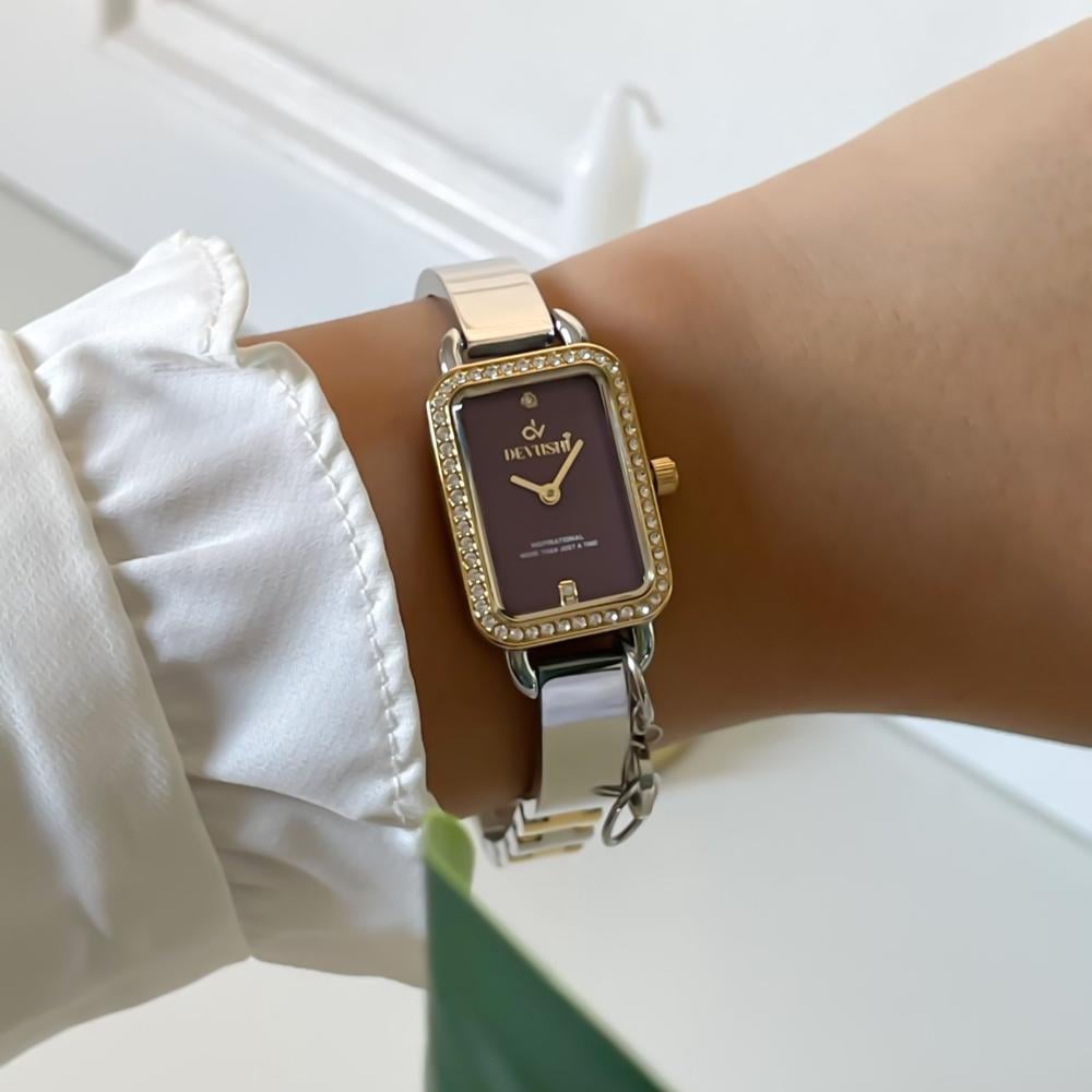 الساعة تأتي بهيكل من الستانلس ستيل المقاوم للصدأ بلون ذهبي وفضي جذاب، مع إطار مرصّع بفصوص الزركون البراقة التي تمنح لمعانًا ساحرًا يلفت الأنظار. ميناء الساعة البنفسجي مصمم بعناية. وتتميز بكونها مقاومة للماء، مما يجعلها مثالية للاستخدام اليومي والمناسبات الخاصة دون قلق.
