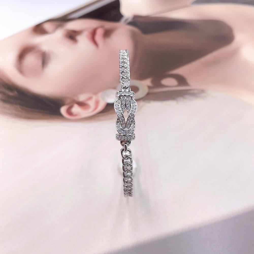 يرافقها سوارة زركون فضية فاخرة بتصميم أنثوي أنيق تضيف لمعانًا جذابًا لمعصمك.