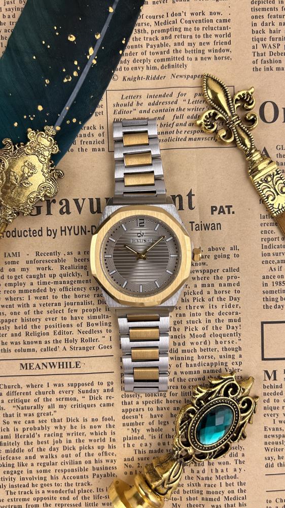 تأتي الساعة بسوار كامل من الاستيل الفضي والذهبي المطفي، مع واجهة أنيقة بلون رمادي، ولمسة نهائية تعكس القوة والاحتراف.