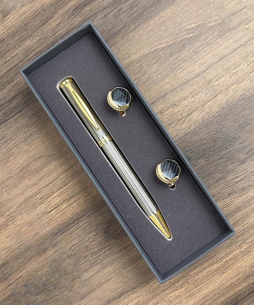 طقم رجالي فاخر يتكون من قلم أنيق وكبك عصري مصنوعين من الاستيل المقاوم للتغير لضمان متانة وأناقة تدوم.