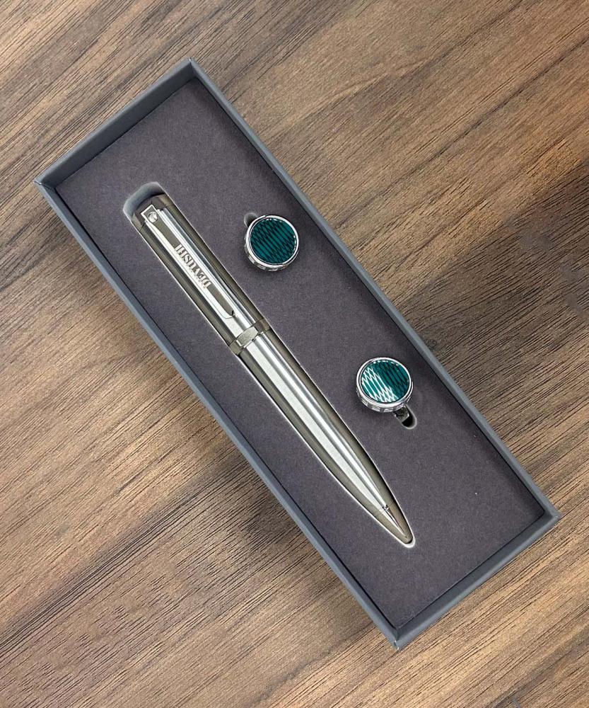 طقم رجالي فاخر يتكون من قلم أنيق وكبك عصري مصنوعين من الاستيل المقاوم للتغير لضمان متانة وأناقة تدوم.