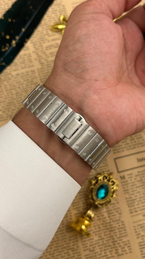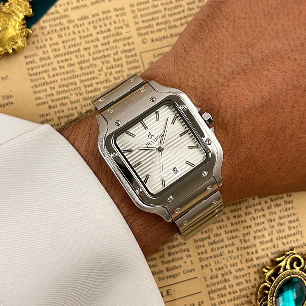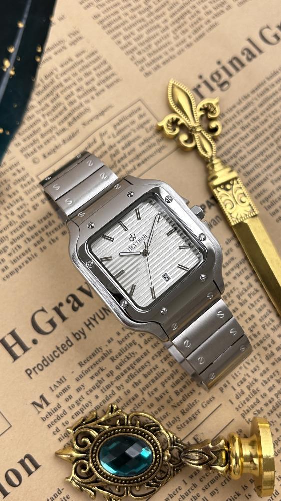 تأتي الساعة بلون فضي معدني أنيق مع سوار متكامل من الفولاذ، وتفاصيل مستوحاة من التصاميم الكلاسيكية المربعة لكن بلمسة عصرية ملفتة. ميناء الساعة المنقوش يضيف بعدًا بصريًا فريدًا وأناقة لا تُضاهى، فيما يوفر السوار المريح ثباتًا وأناقة في آنٍ واحد.
