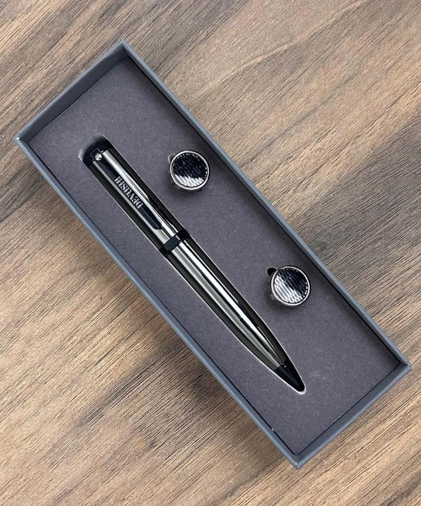 طقم رجالي فاخر يتكون من قلم أنيق وكبك عصري مصنوعين من الاستيل المقاوم للتغير لضمان متانة وأناقة تدوم.